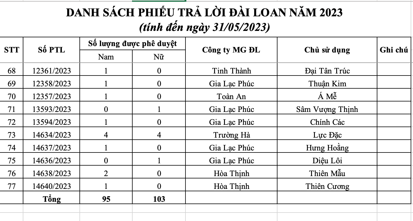Danh sách Phiếu trả lời Đài Loan năm 2023 (tính đến ngày 31/5/2023).