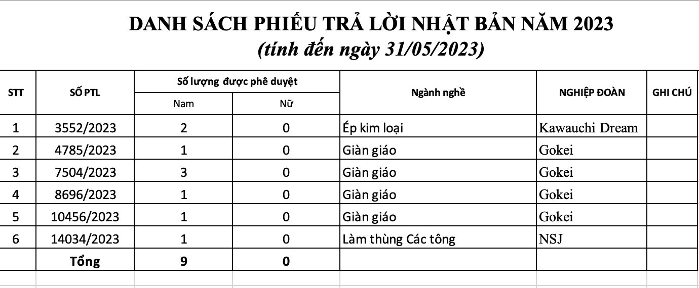 Cập nhật và công khai danh sách Phiếu trả lời Nhật Bản năm 2023 (tính đến ngày 31/5/2023).