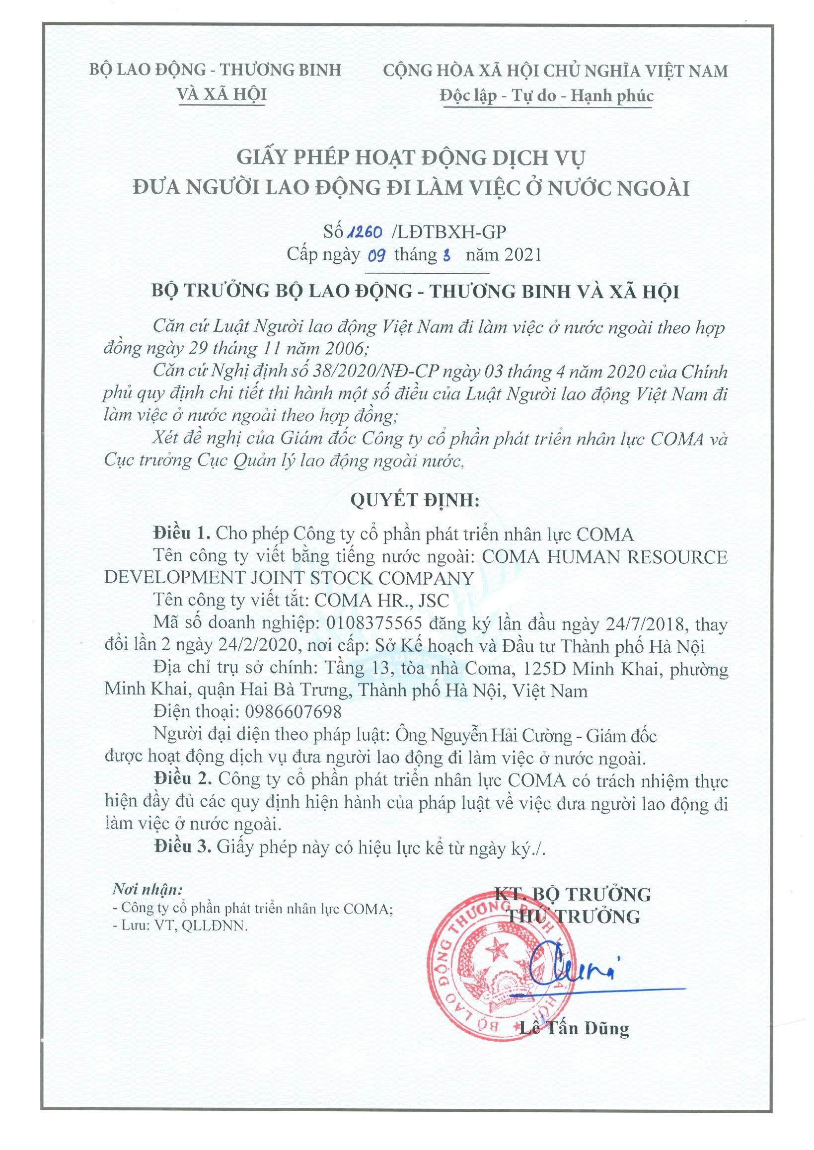(Ảnh: Giấy phép đưa người lao động đi làm việc ở nước ngoài do Bộ Lao động thương binh và xã hội cấp cho Công ty cổ phần phát triển nhân lực COMA)