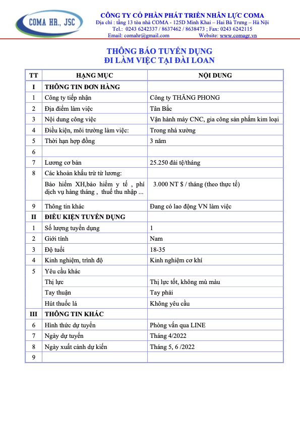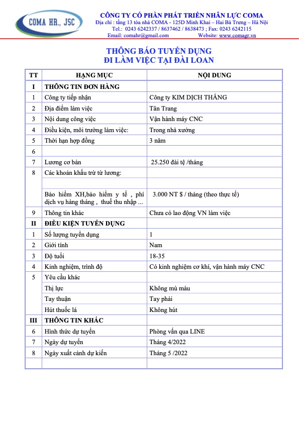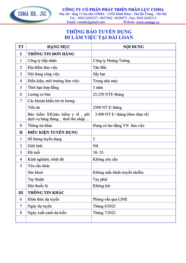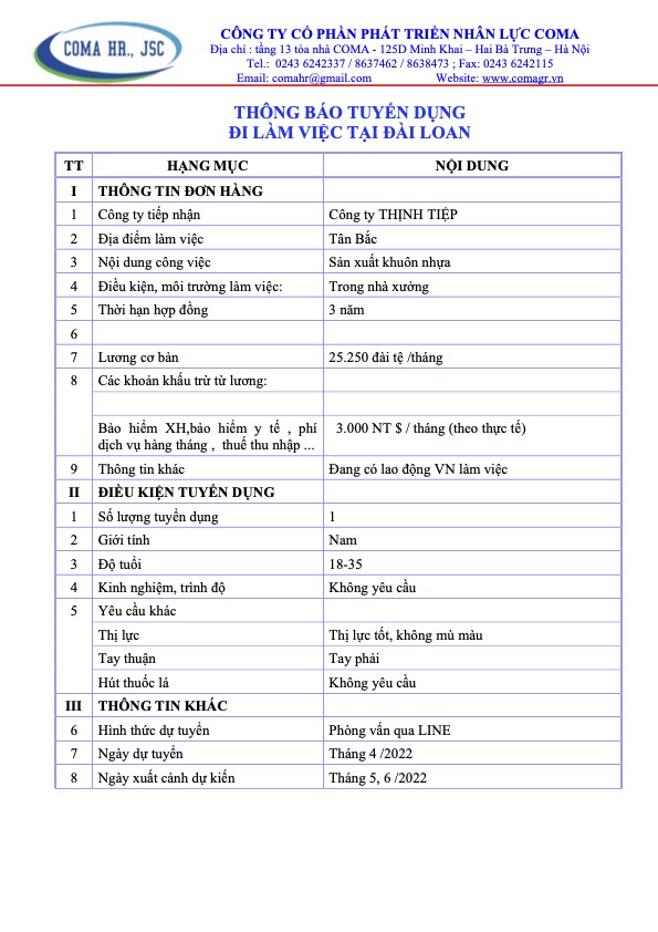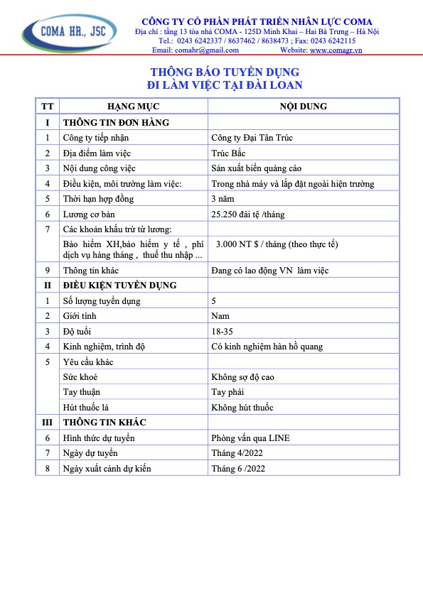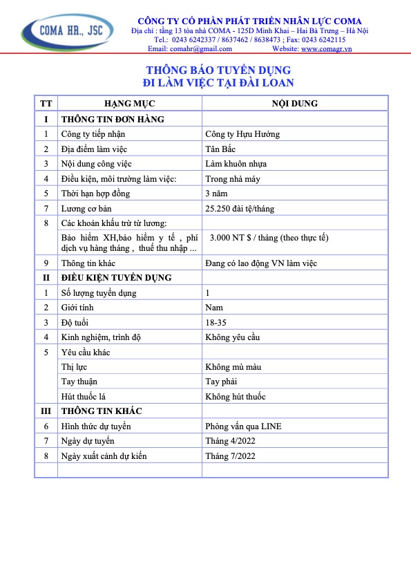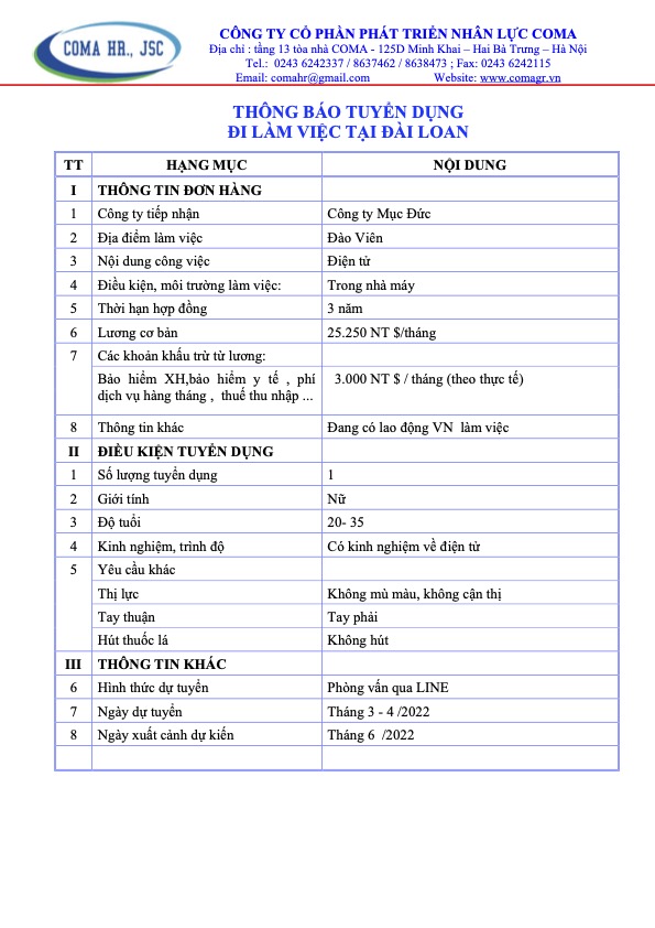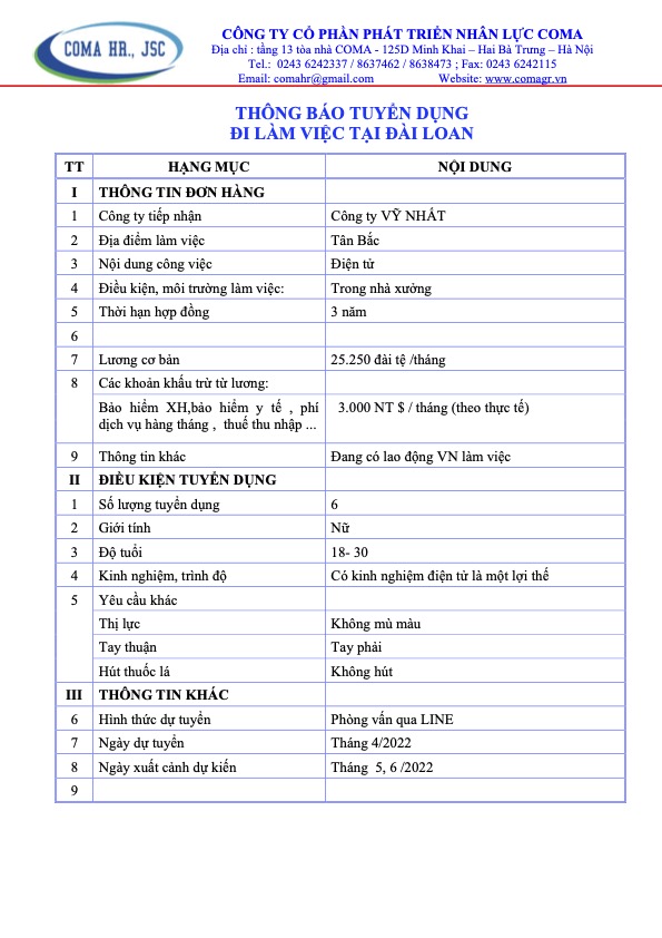 Thông báo tuyển dụng các đơn hàng thị trường Đài Loan tháng 4 năm 2022